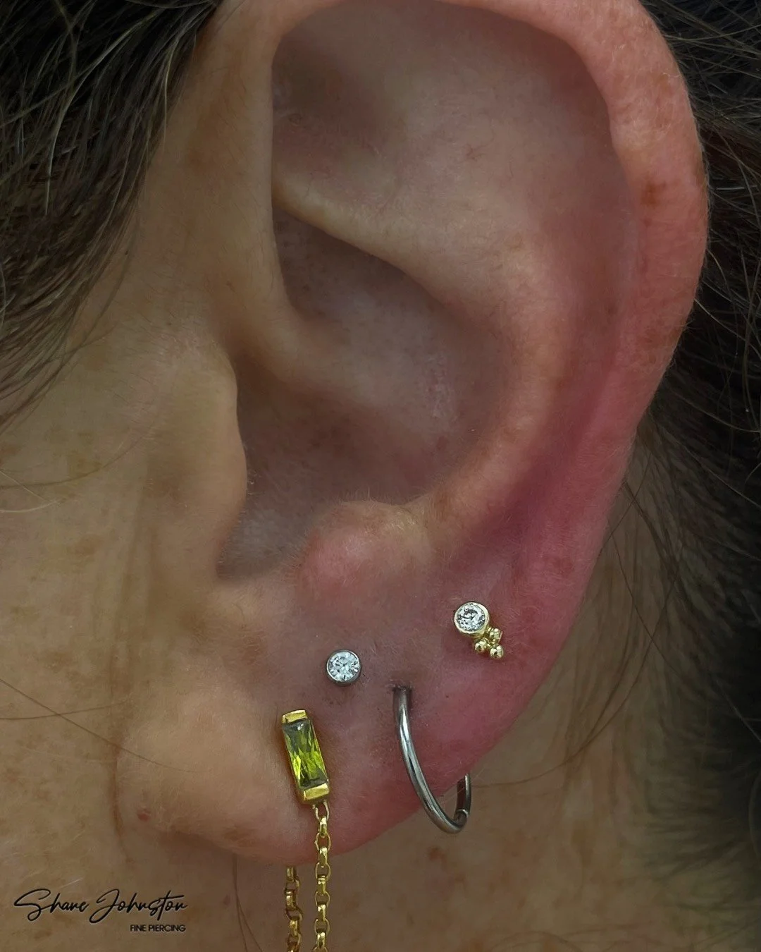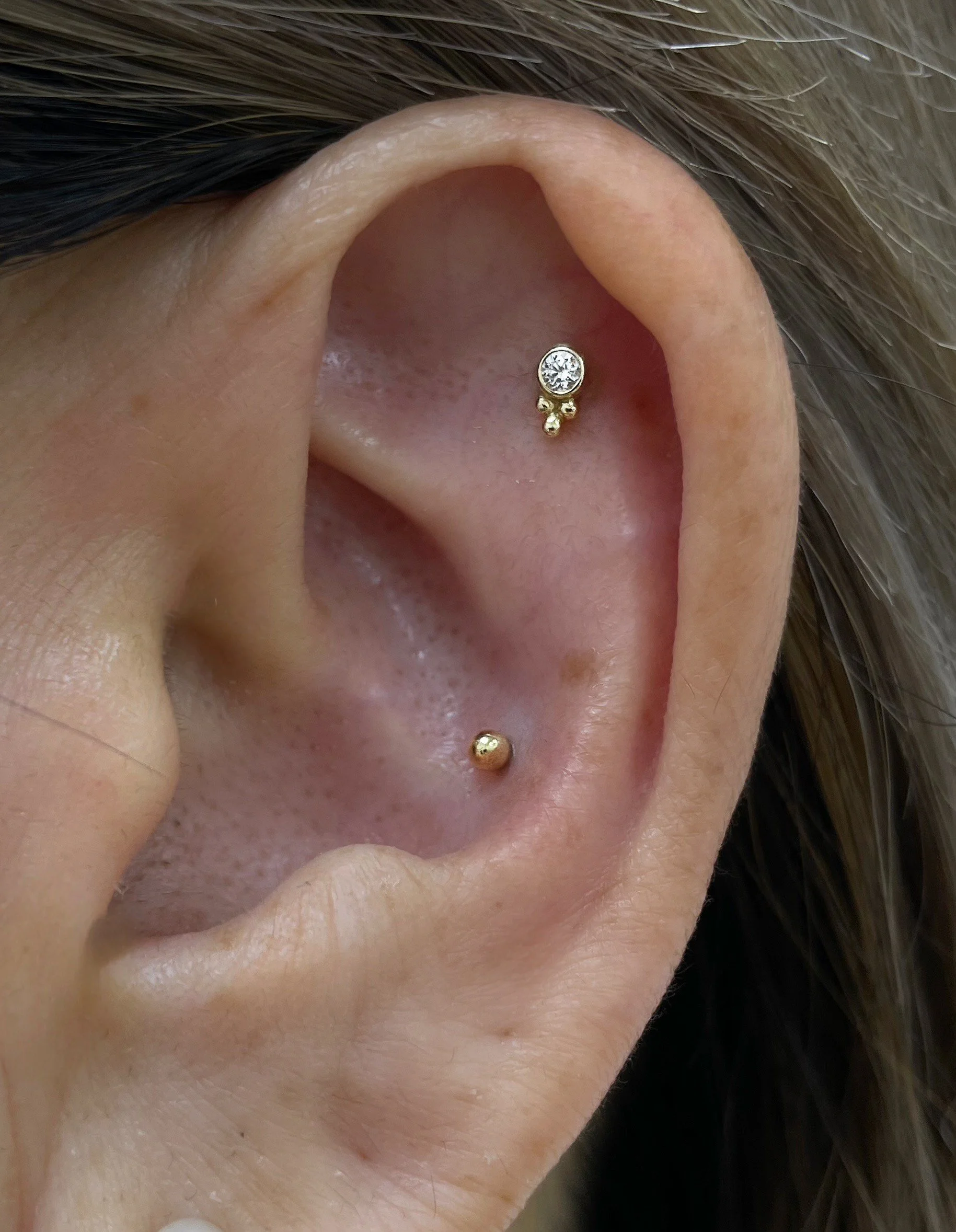 Our Goldy Luxe piece features a single bezel-set stone framed by a trio of polished gold beads. Its clean, geometric design brings a modern edge to any look, adding just the right touch of shine.